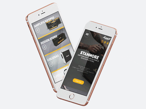 Marshall’s logo is their name handriten in pure black n'white. In order to keep a clean appearance, we just added a 'goldenrod' yellow. The remaining choices for the scheme are neutral colors adding elegance and performance. The pictures on the website are very beautifull. Marshall's design is brilliant at creating these pictures. They add all the irreverence one need to feel like a Rockn'Roll star.